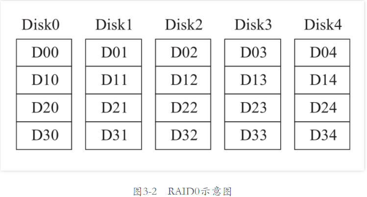 - 即Data Stripping(数据分块,数据条带化)。将整个逻辑盘的数据分块地分布在多个物理磁盘上,可以进行并行读写,提供最快速度,但是没有冗余能力。