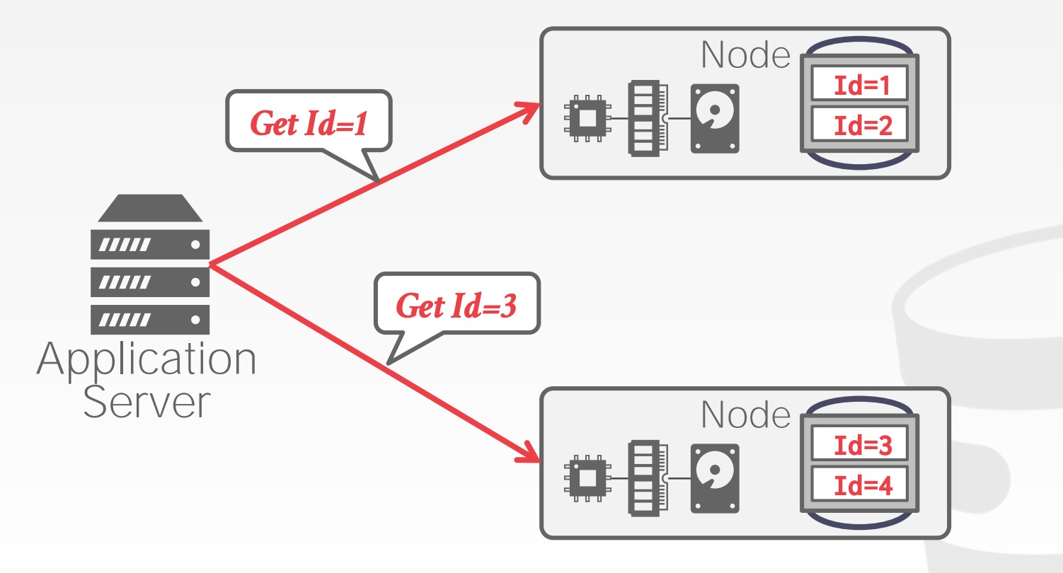 ID 为 1-150 之间的数据落在上面的节点,151-300 之间的数据落在下面的节点。像“哪个节点存储哪些范围的数据”这样的信息会有一个配置中心来存储。如果客户端要查询 Id=200 的数据,那么只需要访问下面的节点即可。如果客户端要同时获取 Id=10 和 Id=200 的数据,事情就会变得更复杂一些: