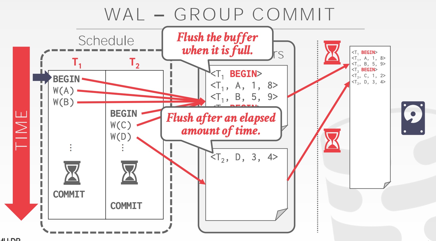 每次事务提交时,DBMS 都必须将日志记录落盘,由于落盘的操纵对于内存操作来说用时较长,因此可以利用 group commit 来批量刷盘从而均摊落盘成本。